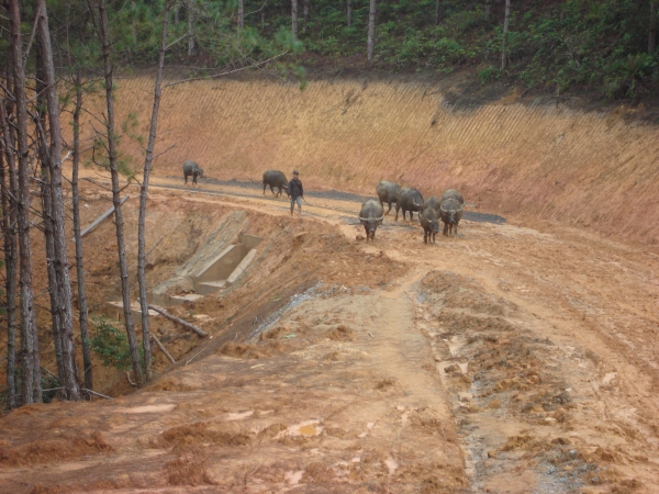 | Small herd of nine water buffaloes and their keeper on a road being built |