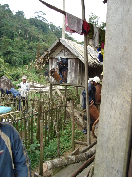 | Young men wearing motobike helmets, storing paddy in a granary next to a house. Washed clothes are hanging on a wooden bar |