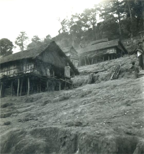 | Stilt houses on a hill slope. Two people in the front platform of the first house |