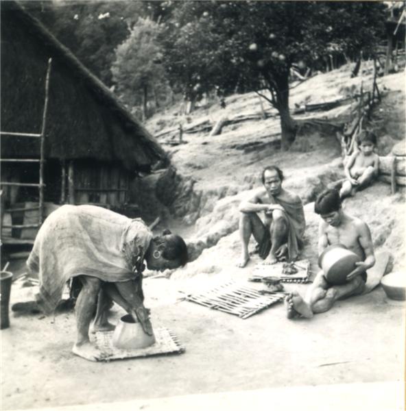 | Potter shaping up a pot on a grid, turning. A sitting young man smoothing a pot near him while another man is watching him |