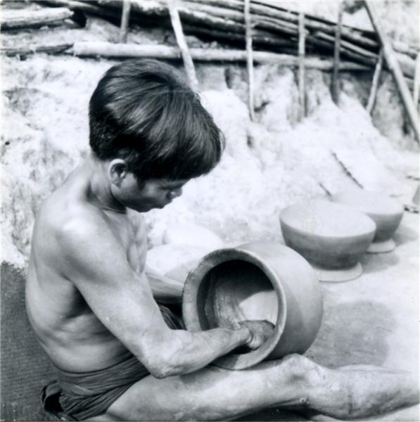 | Young potter with trimmed hair smoothing the inside of a pot. Two other pots lay on the ground, opening upside down |
