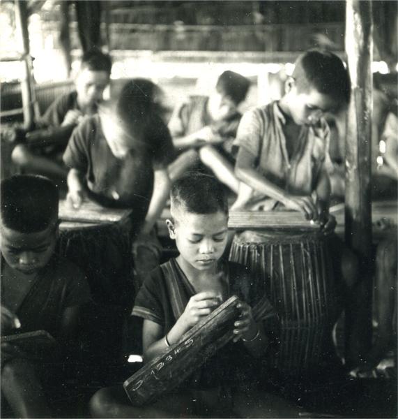 | Schoolboys sitting in a classroom and writing on slates. Drums are used as desks |