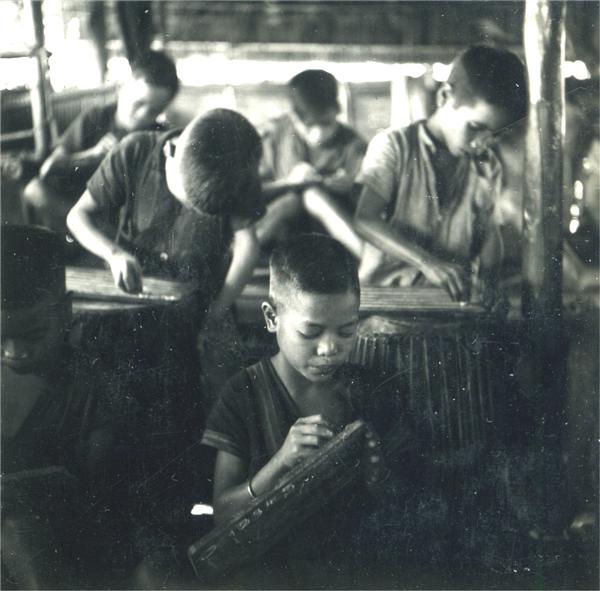 | Schoolboys sitting in a classroom and writing on slates. Drums are used as desks. The pupil on the right of the first row holds his slate very bent to write |