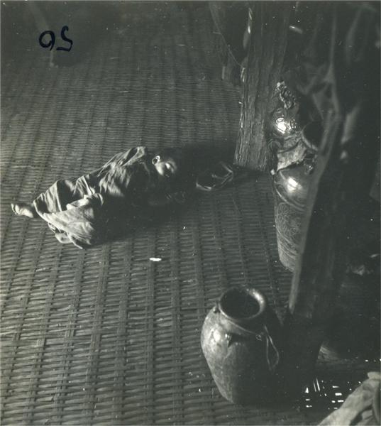 | Young boy sleeping, wrapped in a blanket, on the floor of a house next to several big jars |
