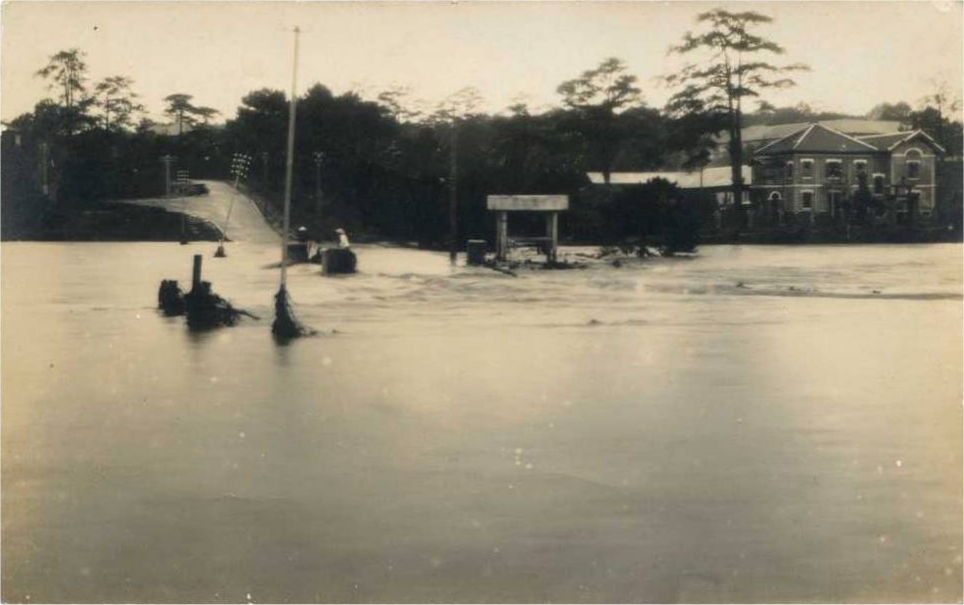 | Flood: large submerged area before a large building. Two Vietnamese in the water |