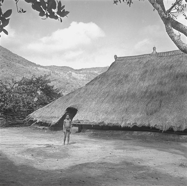 | House with a roof nearly reaching the ground. Young boy standing slightly before its entrance |