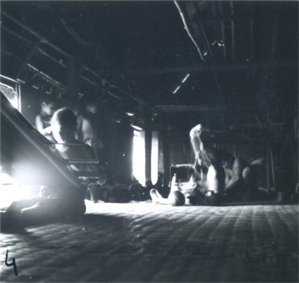 | A family inside a house, the mother working at her loom, the father is on the right next to a child |