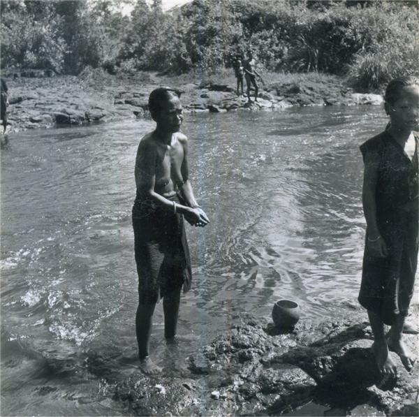 | Topless woman, standing feet in the water on the riverside. A young woman before her on the rocks, a man and a child on the opposite side |