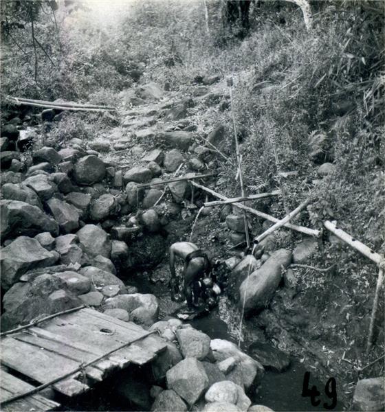 | Man bending, washing under a bamboo tube pouring water at a village water spot |