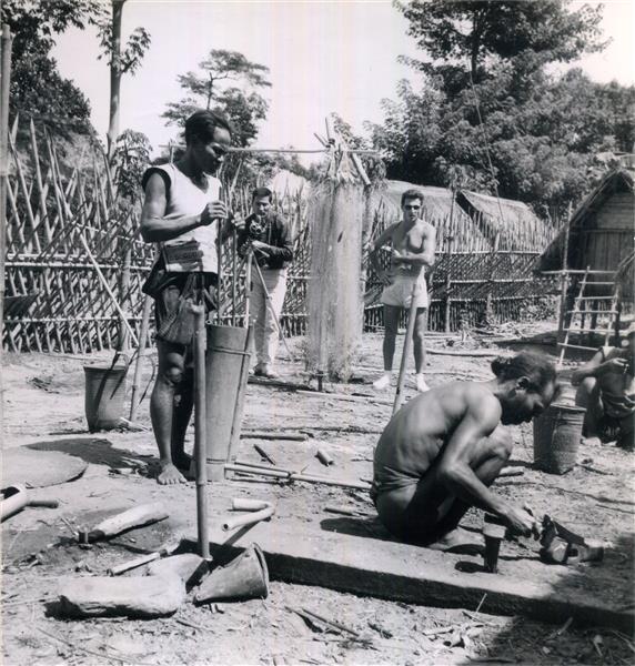 | Squatting blacksmith, hammering a blade of an axe on a small anvil, a hammer in his right hand. His assistant at the bellows behind him. Further away, two white men, of which one is filming the forge |