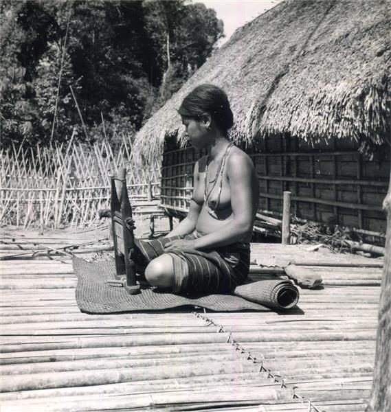| Young woman sitting on the platform of a house on a half-unrolled mat, behind a gin mill |