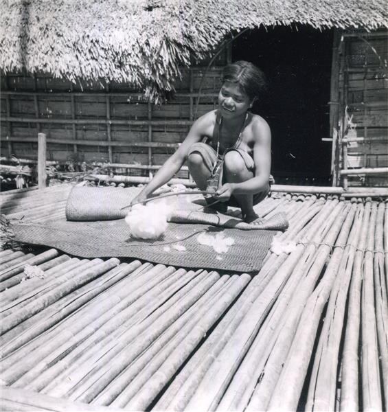 | Young woman squatting on the platform of a house, before a mat where she cotton fibre with a bow she holds in her left hand while the right hand controls the ball of fibre |