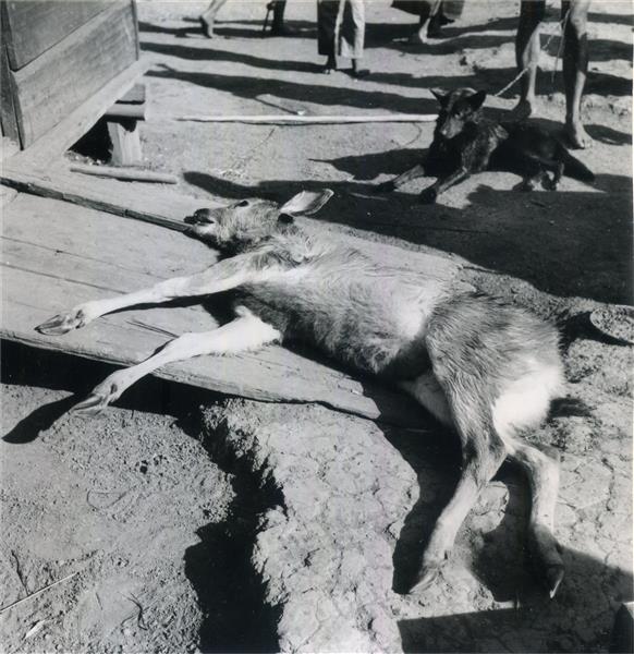 | Doe killed during a hunting party lying on the access plank to a house on stilts. Man keeping a black dog on the leash in the background |