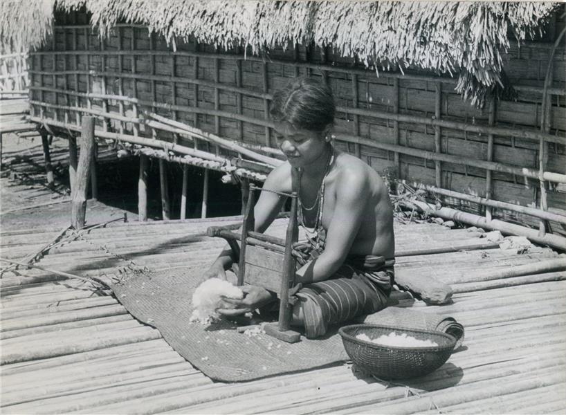 | Young woman squatting on a mat on the the platform of a house. A gin mill where she just put cotton (that she now holds in her two hands) before her |