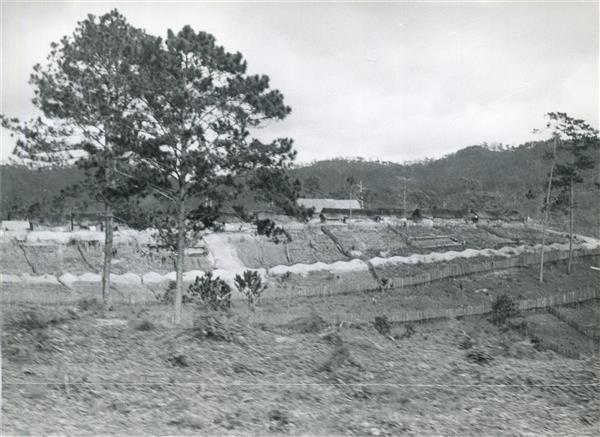 | Village with two protective circular enclosures stretching along a slope. A zigzag shaped trench has been dug between the fences and the first row of houses |