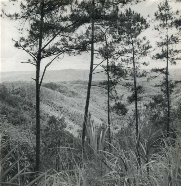 | Hills covered with grown-again forest. Young pine trees on the foreground |