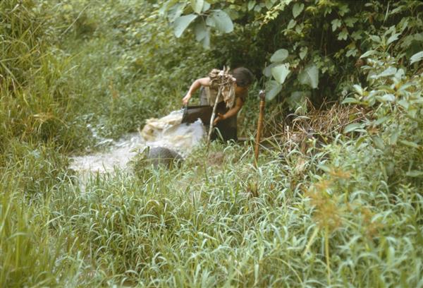 | Young woman emptying a small pond or stream with a small back basket to collect aquatic animals |