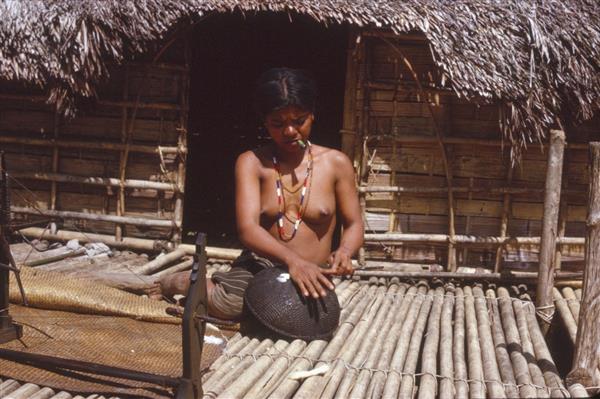 | Young woman, a cigarette in her mouth, rolling up coton fiber around a stick, sitting on the platform of a house, in front of a spinning wheel (close view) |