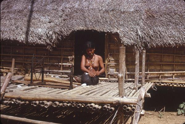 | Young woman, a cigarette in her mouth, rolling up coton fiber around a stick, sitting on the platform of a house, in front of a spinning wheel |