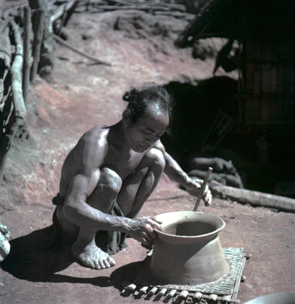 | Squatting man, smoothing the top of a cooking pot set on a rack lying on the ground, his left hand flat holding a spatula |