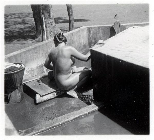 | Young woman washing at a cement fountain. She turns her bust away from the photographer |
