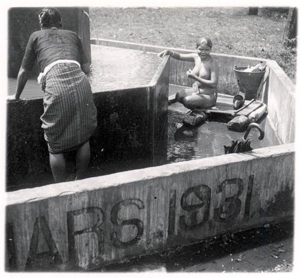 | Young woman, seen from the side, washing at a cement fountain. Another woman seen from the back, hands leaning on the fountain's edge, is bending towards the tank |