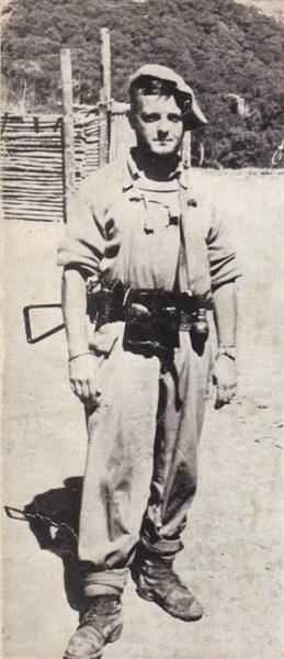 | European soldier in combat uniform, submachine gun on the side, beret leaning on the side. A log construction behind him |