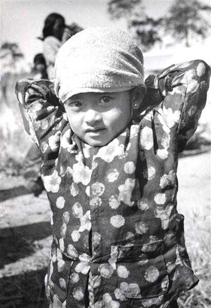| Small girl, arms behind her head. She wears a floral patterned shirt and a towel rolled up around the head |