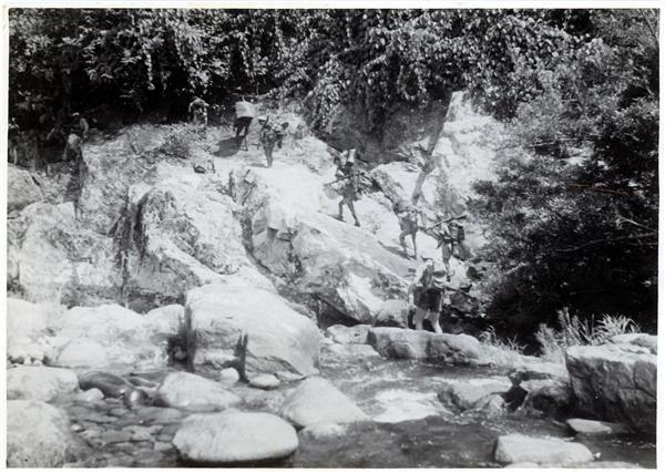 | Several soldiers in a line, one of them a white man walking last, climbing over large rocks of a riverside. Two or three young porters walking with them |