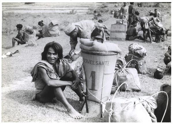 | Smiling (and showing filed teeth) porter sitting on an elevated path next to a back basket labelled "SERVICE SANTÉ 1". Other young porters sitting a little further |
