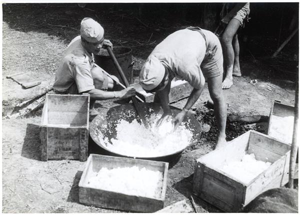 | Two soldiers preparing rice in a large basin placed on the ground in the middle of boxes of ammunition reused as dishes containing rations of rice |