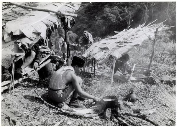 | Two soldiers preparing their meals over wood fires near temporary shelters erected on a slope. The first shelter has a raised floor on which a soldier is lying |
