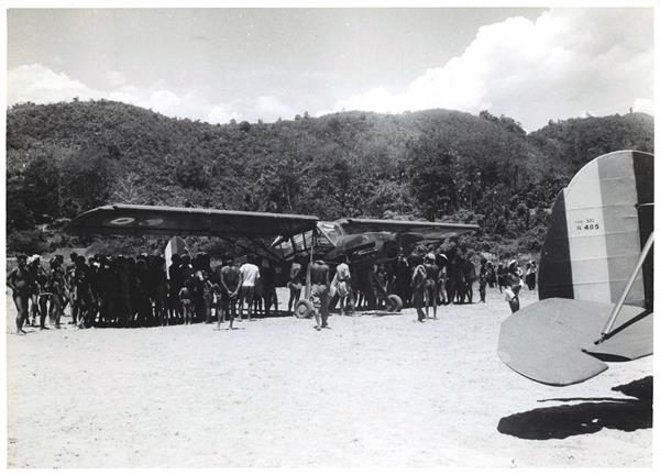 | Group of about forty men with a few children surrounding an observation plane on a sandy ground in front of a hill. The tail of another plane in the foreground on the right |
