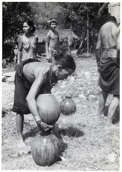 | Woman bending over to pour water from one jar into another. Two other women and a young man next to her. A house on stilts in the background |