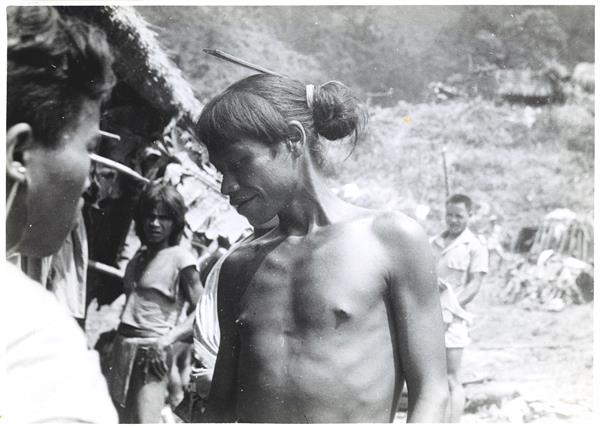 | Man wearing a bun with a comb stuck in it in front of a house in a village. Two other men with short hair and western dress around him |