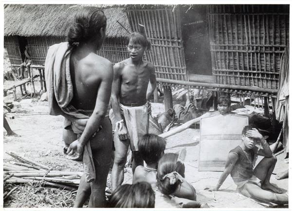 | Seven young men (including three wearing a bun and two of them with a comb stuck in) in front of houses on stilts in a village. One of the young men sits behind a rain shield |