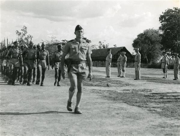 | Group of soldiers with a white officer preceding the troop by about twenty yards, marching past six white officers standing at attention in three lines standing to the right of the photograph |