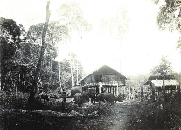 | White man in colonial uniform climbing on the platform of a house on high stilts where two people are visible in a French window. Several buffalo carts parked in front of a shelter |