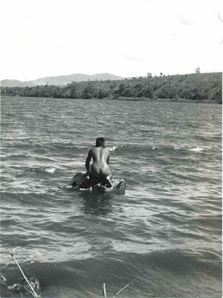 | Nude man with short hair doing his washing in a lake |