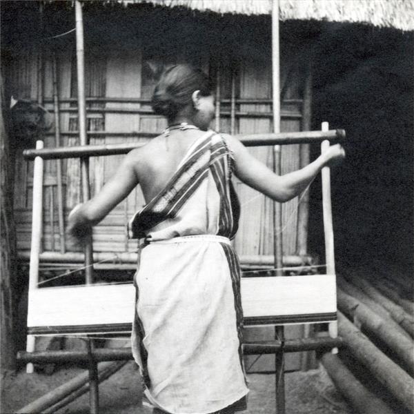 | Femme debout devant une maison, enroulant du fil de chaîne autour d'un cadre pour préparer son tissage |