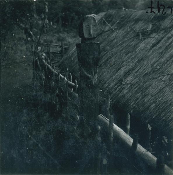 | Sculpture d'une clôture de tombe anthropomorphe masculine, mains sur le sexe en érection |