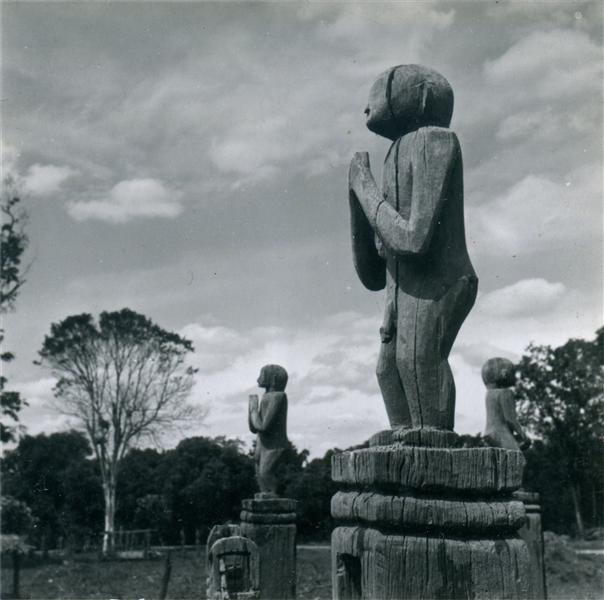 | Deux sculptures d'orants sur des poteaux de bois déjà travaillés par les intempéries. Le sexe masculin est très apparent sur la première statue |