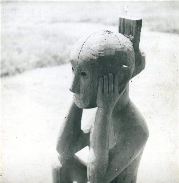| Sculpture de poteau anthropomorphe d'un homme dans la position typique du Sud-Est asiatique (autre position) |