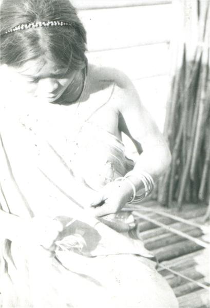 | Jeune femme assise et tenant un batonnet dans sa main gauche qu'elle semble entourer d'un fil (tirage surexposé) |