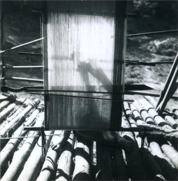 | Jeune femme cachée par le cadre de son tissage posé sur une platerforme |