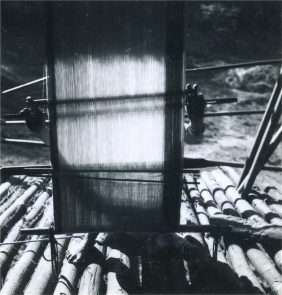 | Jeune femme cachée par le cadre de son tissage posé sur une platerforme. Les deux mains de chaque côté du cadre tiennent la barre |