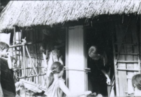 | Jeune femme assise sur une plateforme, tissant. Plusieurs personnes autour d'elle la regarde |