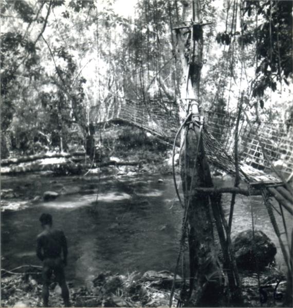 | Pont de liane sur une petite rivière. Un homme debout à sa gauche sur la rive |