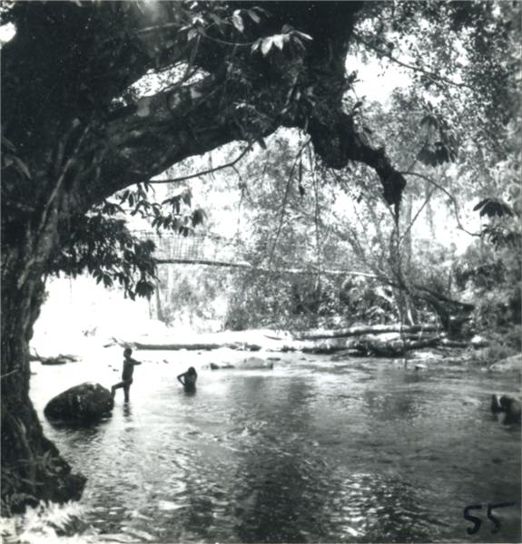 | Deux hommes se baignant dans une petite rivière, l'un avec une jambe posée sur un rocher. En arrière, un pont de liane |