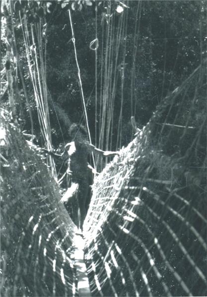 | Jeune homme suivi d'autres au début d'un pont de liane aux rambardes-parois formant un véritable hamac |
